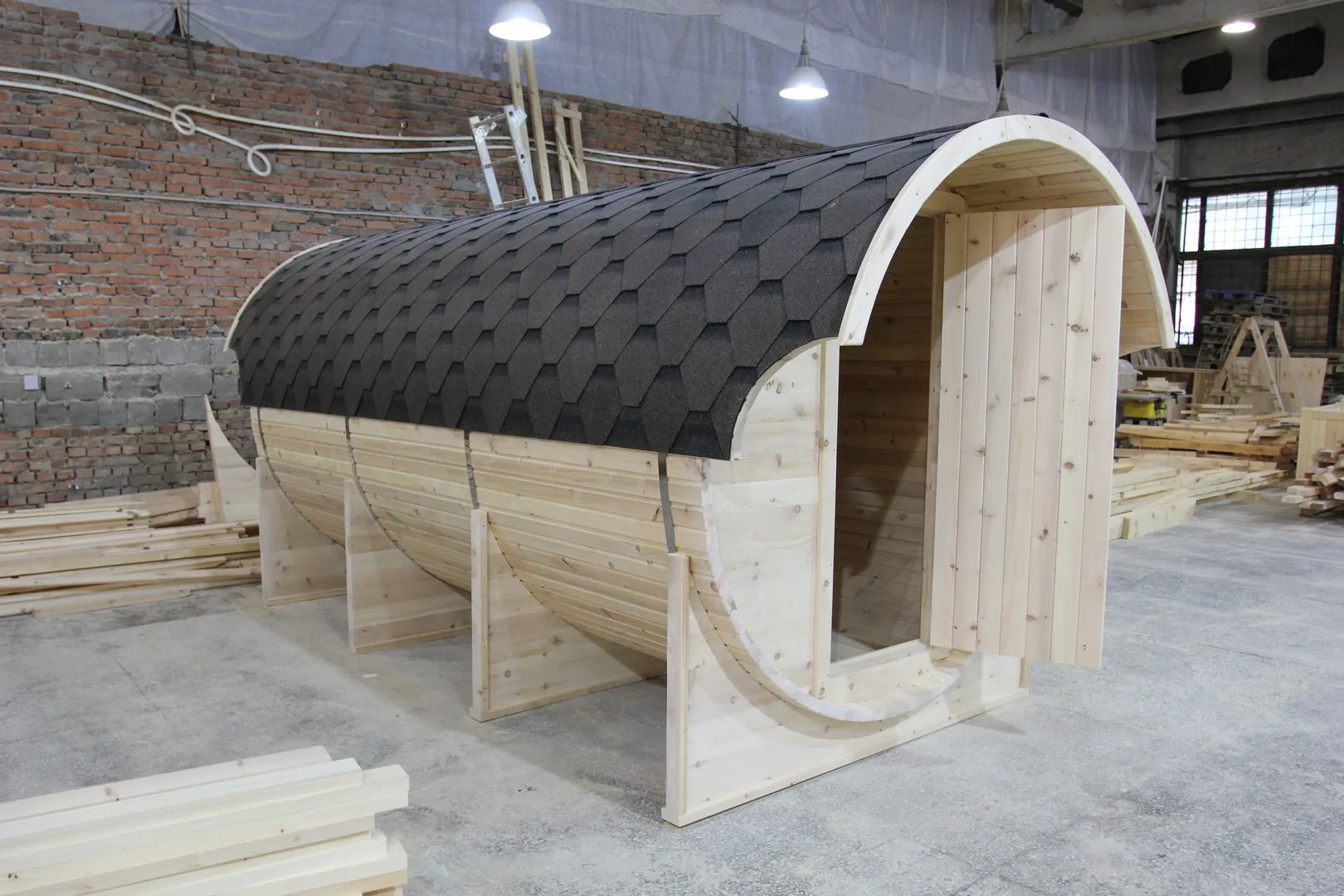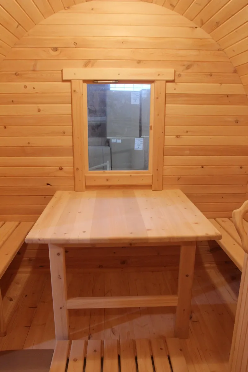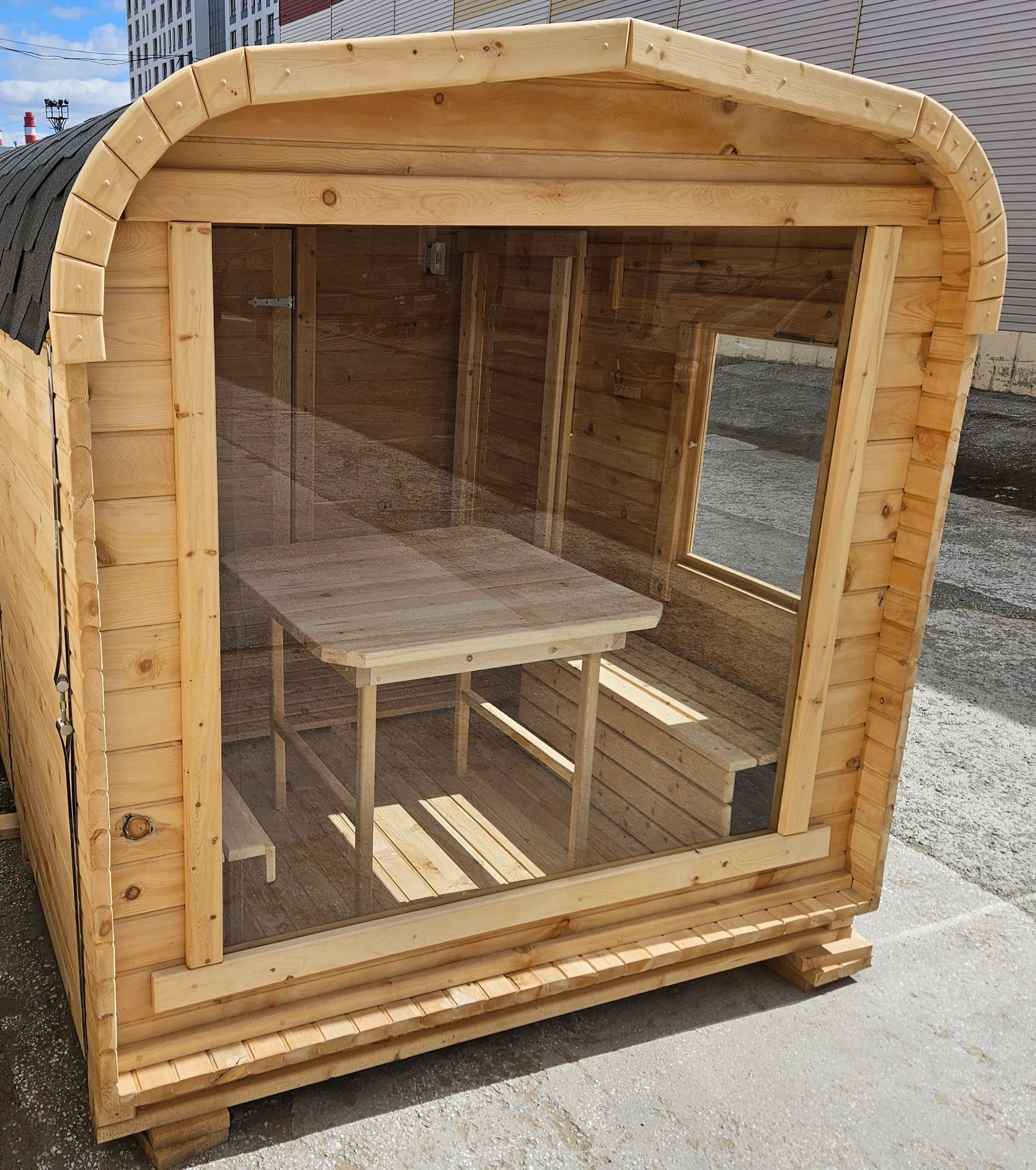 Отличная баня-бочка, брали 6 метров, очень просторная, наша большая семья помещается спокойно! Приехала баня готовом виде, разгрузили и поставили, всё установили и можно париться))