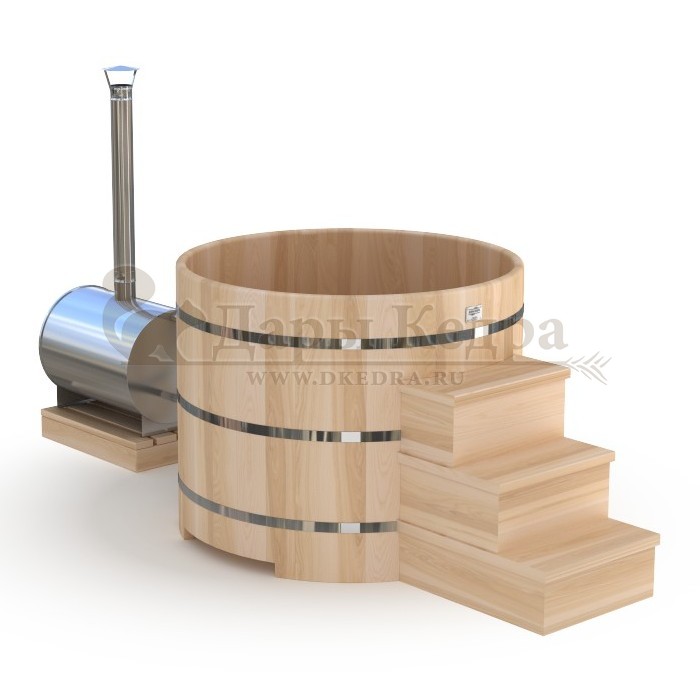 Фурако круглая из кедра со встроенной печью Это уличная баня, которой можно пользоваться круглый год. Купель представляет собой круглую емкость для воды, внутри которой располагаются сиденья из кедра. Нагрев воды происходит за счет встроенной печи, которая находится внутри купели за перегородкой. Рекомендуем приобрести термокрышку и весло для перемешивания воды для ускорения нагрева. Для удобства пользования японская баня фурако оборудована внешней и внутренней лестницей из кедра. В комплектацию этой модели входит совок с длинной ручкой, который позволяет извлекать угли и золу после эксплуатации изделия. Целебная древесина кедра богата фитонцидами и эфирными маслами, которые активируются при нагревании. Таким образом, во время процедур парения организм насыщается полезными веществами. , ,