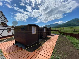 Компактный однокомнатный домик подойдет для дачного использования в теплое время года или обустройства загородных баз отдыха. Домик оборудован двумя лежаками из кедра, между которыми пользования можно поставить откидной столик. Для удобства пользования кемпинг дом можно укомплектовать верандой с лавочками или козырьком.