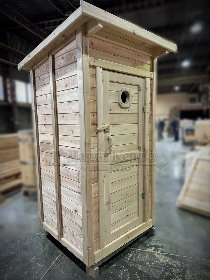 Туалет уличный из кедра Уличный туалет из настоящего кедра. Данная модель оснащена козырьком, стульчаком и декоративным окошком в двери.