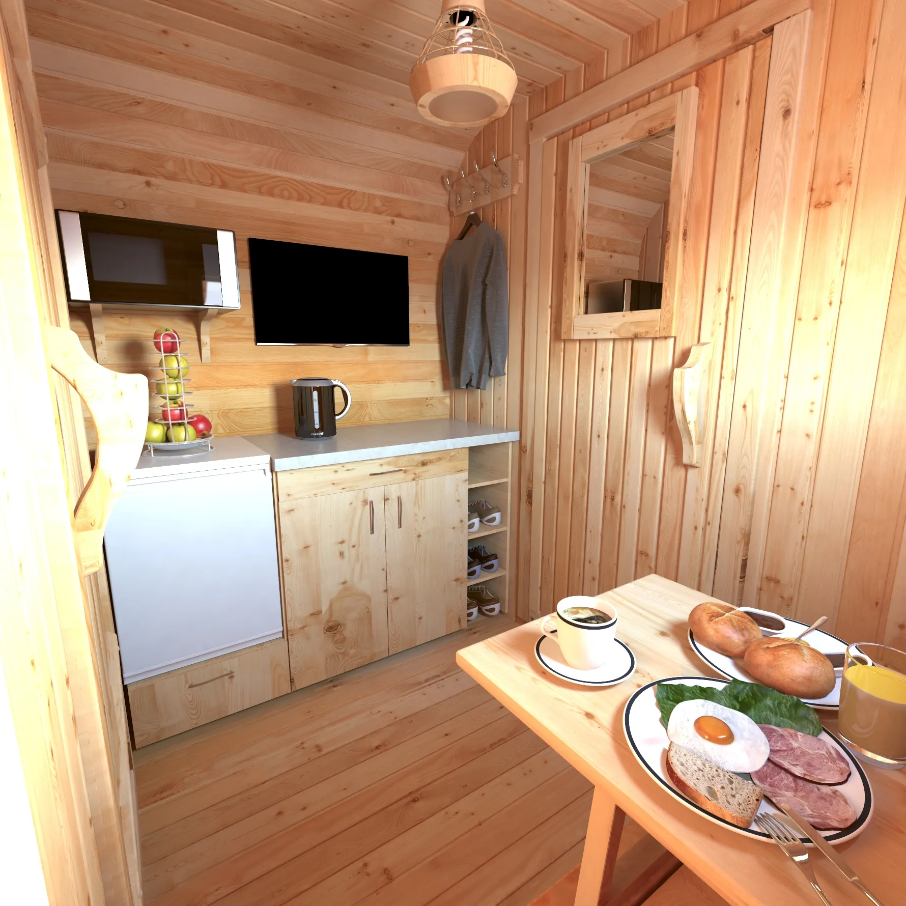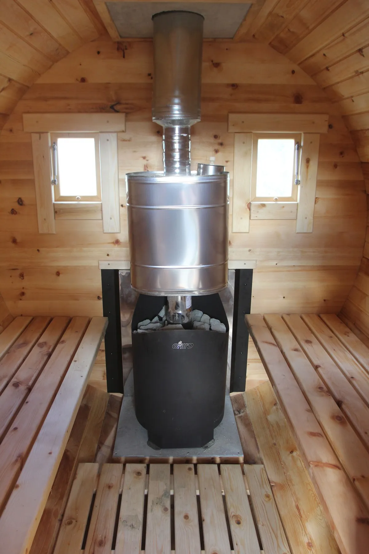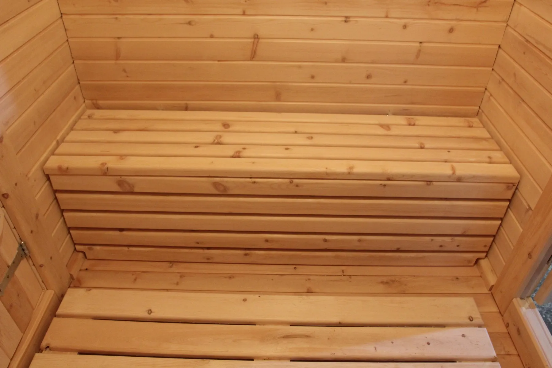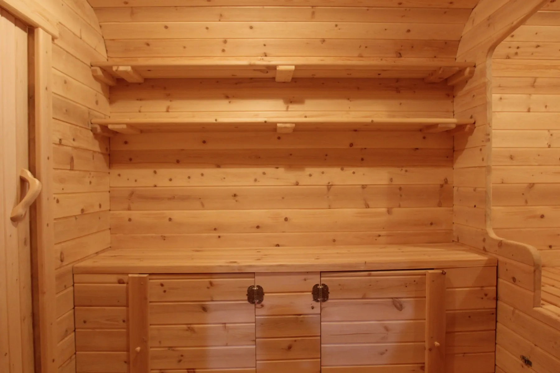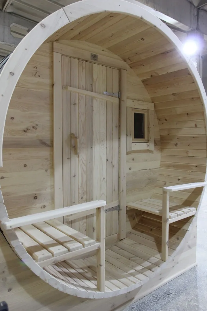 Овальная баня-бочка из кедра просторная и вместительная. Имеет два отделения: раздевалку, которую можно использовать как комнату отдыха, и парилку. Для удобства пользования раздевалка оснащена лавочкой, полкой и вешалкой из кедра. В парильном отделении располагается печь и двухуровневый открытый полок. Для установки такой модели не требуется полноценный фундамент, поэтому при необходимости ее можно перенести на другое место. Так же баню-бочку можно укомплектовать верандой со скамейками, козырьком и печью с внешней загрузкой, благодаря которой весь мусор после топки останется на улице.