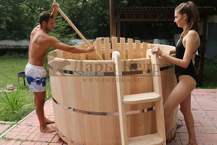 - Влажность воздуха влияет на состояние древесины: при повышении параметра древесина разбухает, при снижении, наоборот, сохнет. В связи с этим очень важно давать дереву просохнуть после 5-6 дней эксплуатации. В течение суток купель должна стоять пустая, обработанная дезинфицирующим средством, не содержащим хлора, подходящим для очистки дерева. Ополоснув изделие изнутри, необходимо дать ему проветриться, не накрывать чехлом и крышкой. Через сутки возможно снова пользоваться фурако в течение 5-6 дней, не сливая жидкость. Обязательно нужно следить за чистотой кедровой бочки, так как в грязной воде размножаются микроорганизмы, которые повреждают древесину.