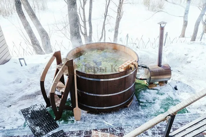 - Когда на улице очень холодно (ниже 0С), то деревянную бочку нельзя оставлять наполненной во избегания замерзания. Как следствие, древесина может лопнуть. Если всё-таки в наполнении есть необходимость, то рекомендуется постоянно подтапливать печь, чтобы вода не превращалась в лёд. Если возможности подтапливать нет, то надо полностью опустошить фурако и закрыть крышкой, чтобы внутрь не попадали осадки.